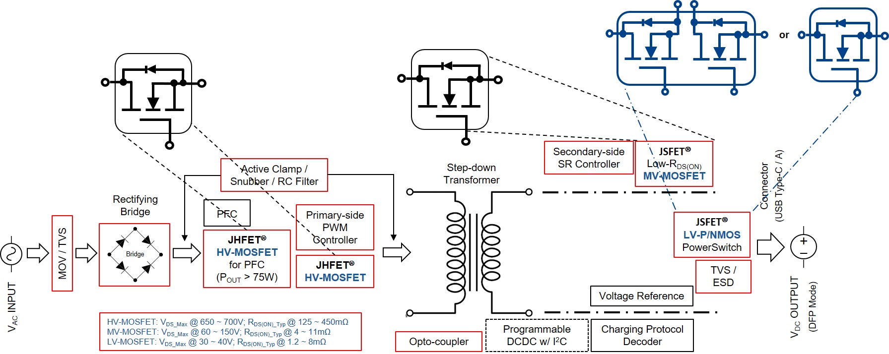 不论在原边使用的是传统的超结高压 MOSFET、或是日益受电路设计工程师及消费者追捧的氮化镓 D/E-mode HEMT,在拓扑的副边,MYBALL迈博微电先进 JHFET® 技术平台超结 (super-junction) 的高压 MOSFETs 在原边开关、先进 JSFET® 技术平台的中/低压 MOSFETs 在同步整流和在 USB-C® 端口电流输出开关等位置,都能提供稳定可靠而高功效的运作。 建立在 JHFET 技术平台的 650VDS_Max SJ N-MOSFETs,导通阻抗 RDS(ON) 低至 169mΩ、Qg 低至 9.7nC、Ciss 低至 333pF,所有产品均百分百通过 UIS 测试。建立在 JSFET 技术平台的 30 ~ 150 VDS_Max SGT N-MOSFETs,导通阻抗 RDS(ON) 低至 1.2mΩ、Qg 低至 7.7nC、FOM 低至 47,所有产品均百分百通过 UIS 测试。凭借极低的 Ciss、Coss、Crss、Qg、和卓越的安全操作区域 (SOA) 等,这些功率器件能更有效地解决在终端应用中存在的 软/硬开关、电感负载、EMI 等难题。能夠有如此突出的静态和动态电气特性,是因为MYBALL迈博微电的自有知识产权 JSFET 及 JHFET 技术平台,各项工艺参数早已跻身国际一流水平。